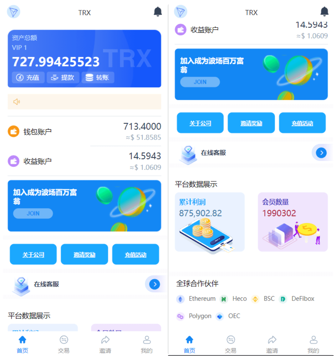 邀请好友或好友充值的收益全部回到钱包账户)