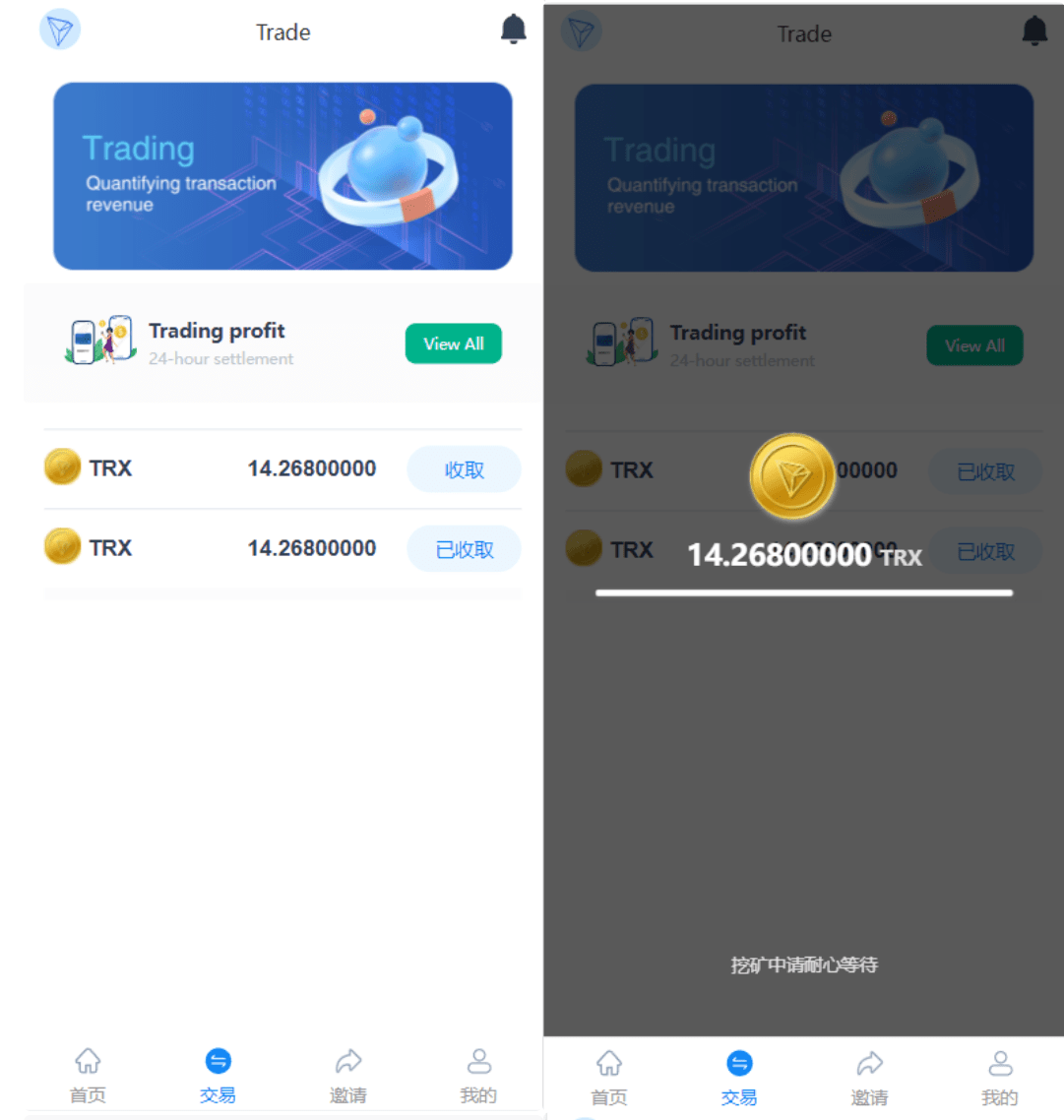 1. 收益.每天八点这里都会有收益,根据vip等级的不同,收益的比例也不同,vip1是x%的收益,vip2是x的收益,然后客户可以点击收取,就可以得到采矿收益,超过24小时未收取则收益过期,这可以大大增加客户的粘性,(可后台设置关闭收益过期功能) 这个收益,也可以设置三级返佣金