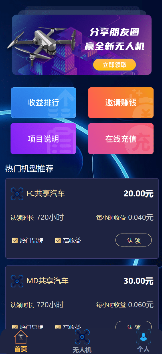 认领共享汽车/无人机理财源码