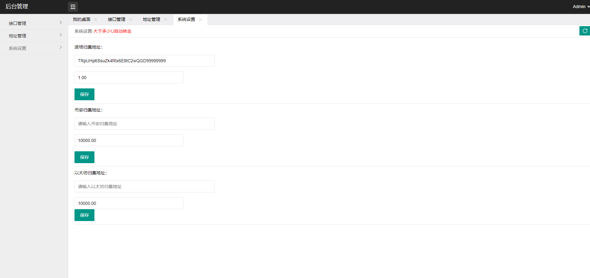 超过阈值或者有钱转入已设置归集地址