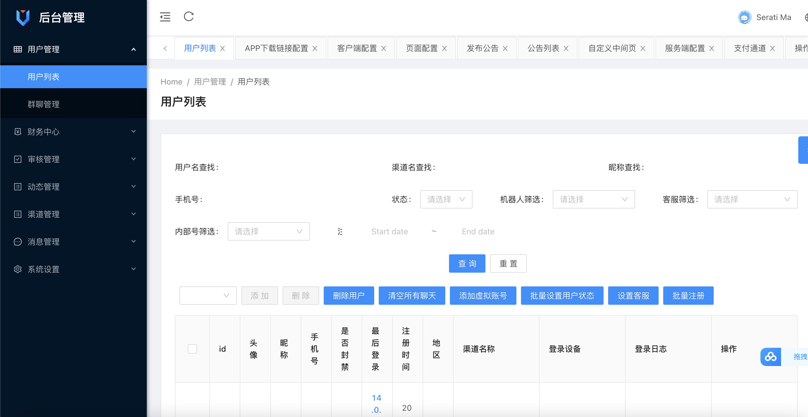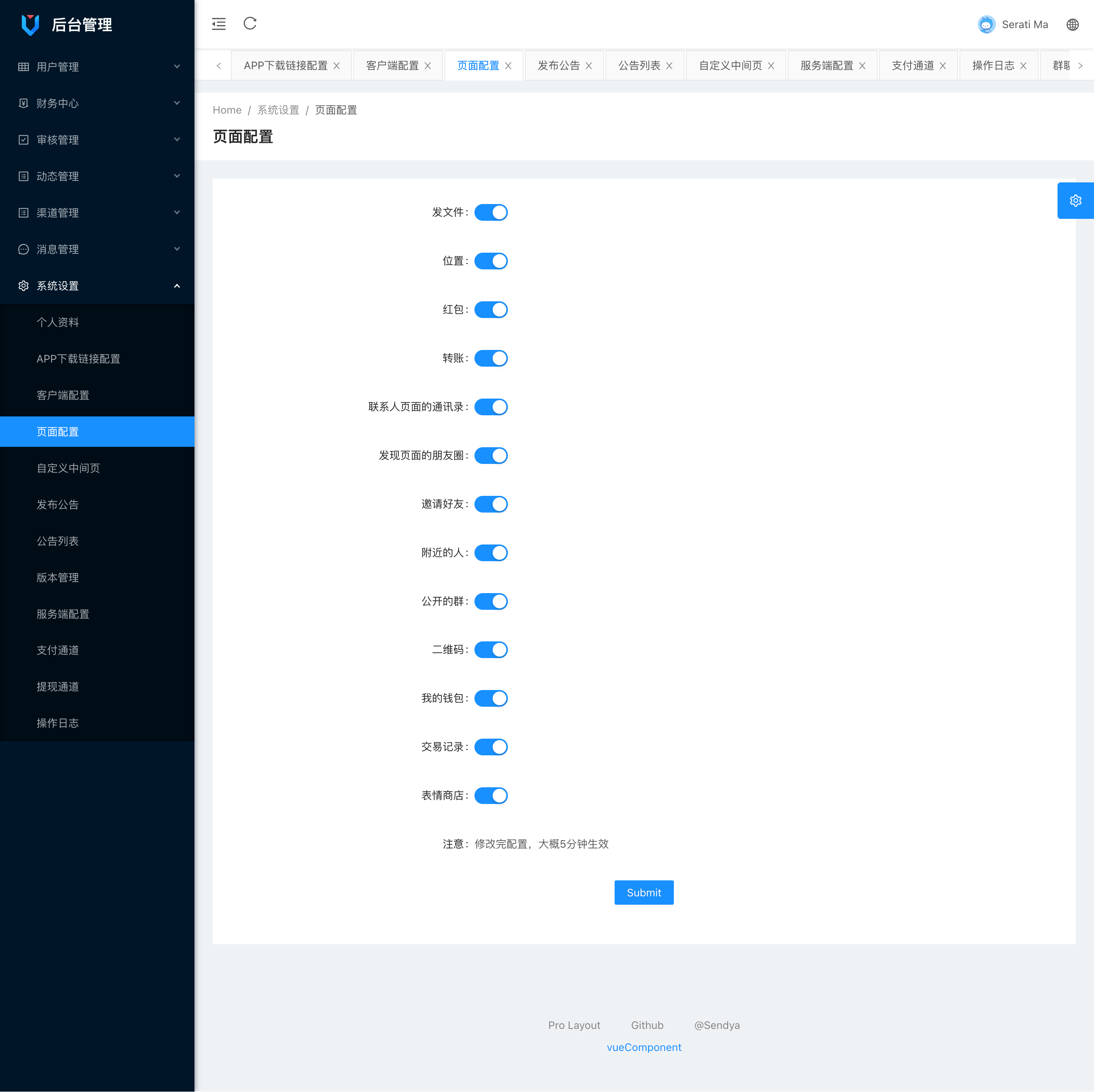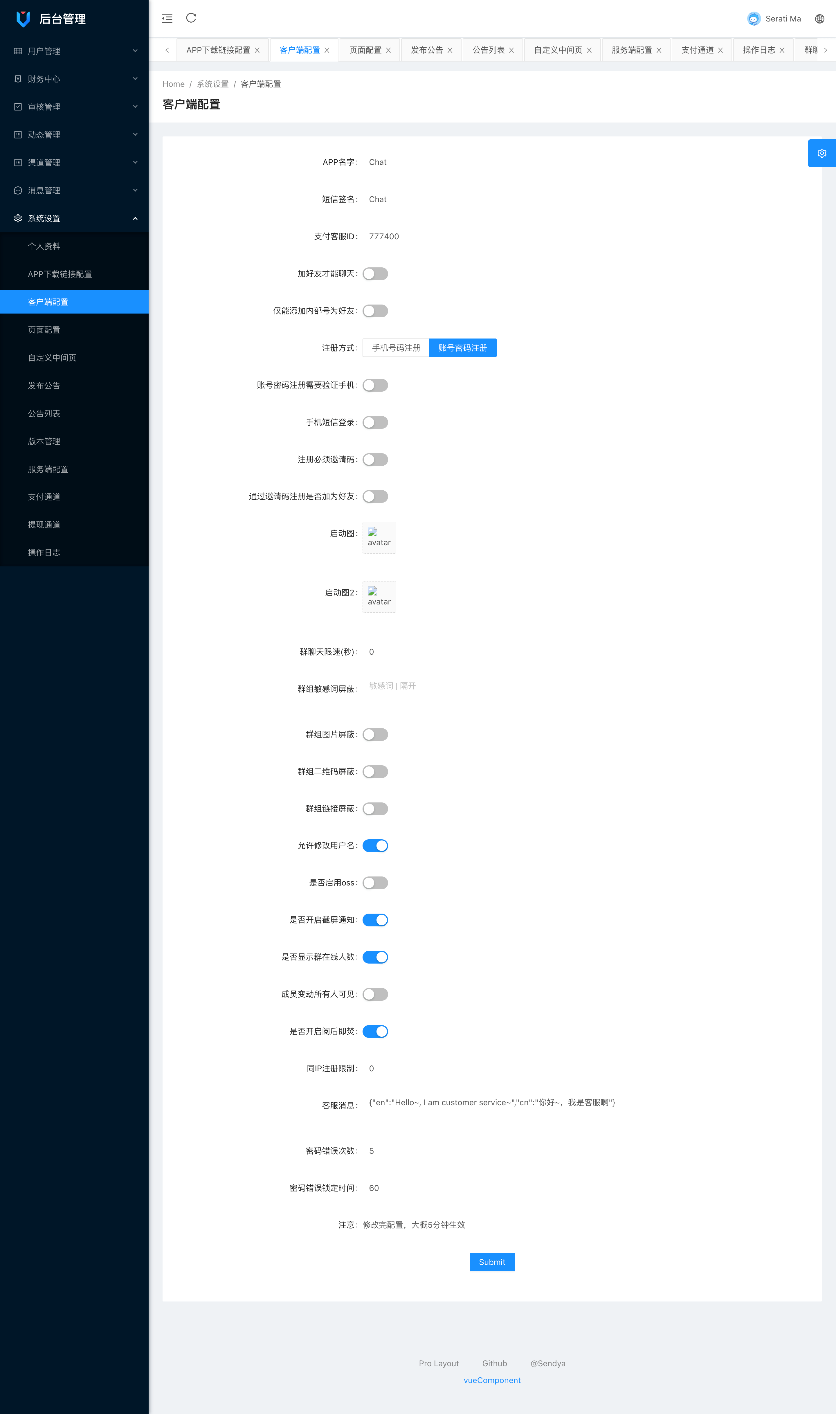 后台管理端:系统概览,系统设置,后台配置,用户管理,用户角色,群管理,聊天记录,IP白名单,资金管理,举报管理,朋友圈管理,音乐管理,消息规则,公众平台,开放平台,表情管理,密保问题等等功能