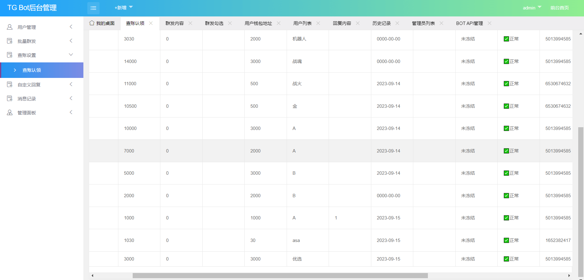 简介:基本的记账功能,查单认领功能,自动回复功能,群发功能,钱包地址信用功能