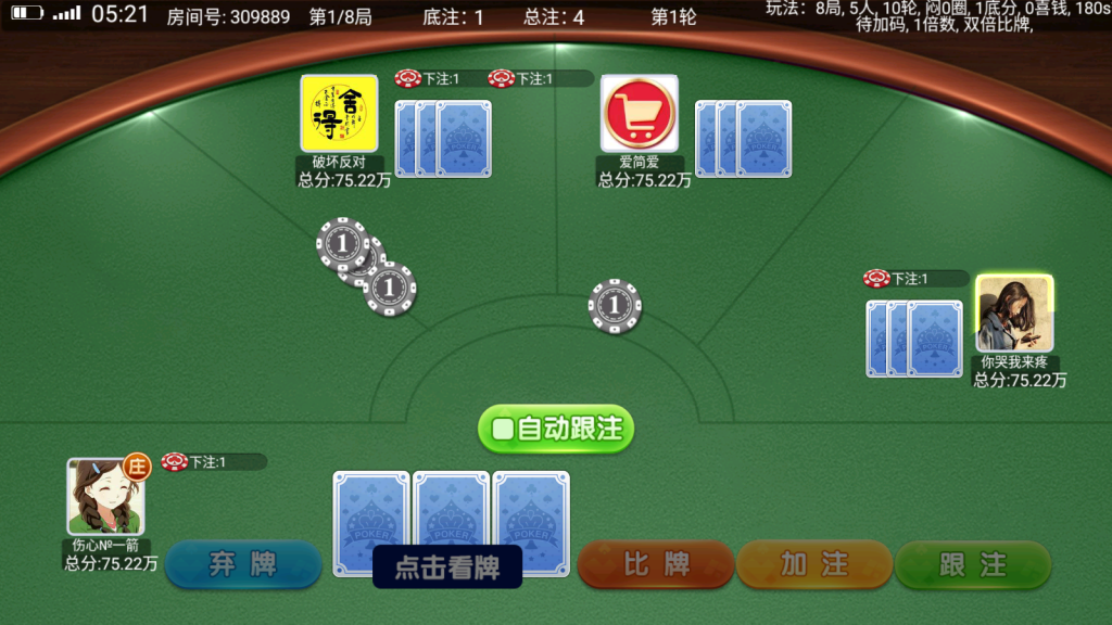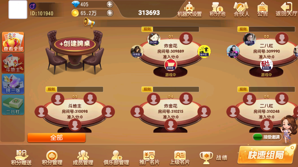 游戏:推筒子(二八杠) 斗地主 炸金花 炸金花,斗地主带控制,炸金花带陪玩,其它占位机器人