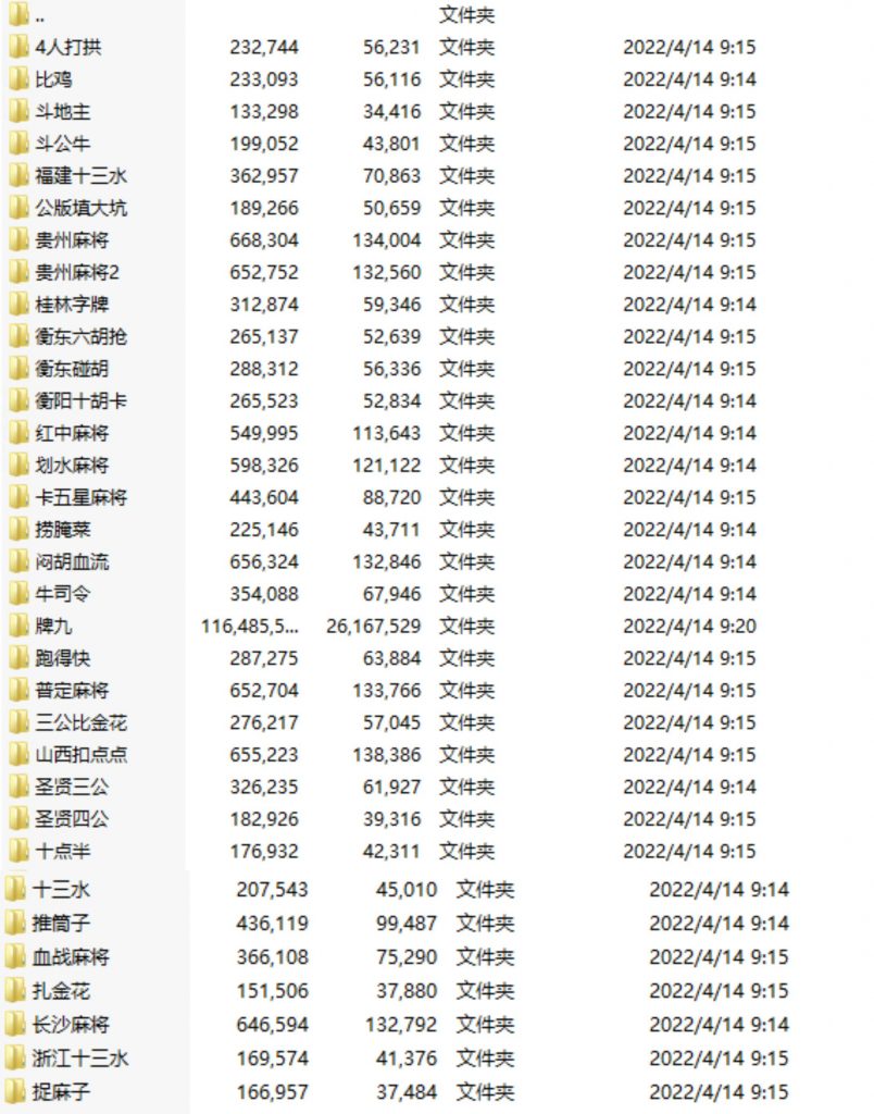 子游戏:4人打拱、比鸡、斗地主、斗公牛、福建十三水、公版填大坑、贵州麻将、桂林字牌、衡东十胡抢、衡东碰胡、衡阳十胡卡、红中麻将、划水麻将、卡五星麻将、捞腌菜、闷胡血流、牛司令、牌九、跑得快、普定麻将、三公比金花、山西扣点点、圣贤三公、圣贤四公、十点半、十三水、推筒子、血战麻将、扎金花、长沙麻将、浙江十三水、捉麻子