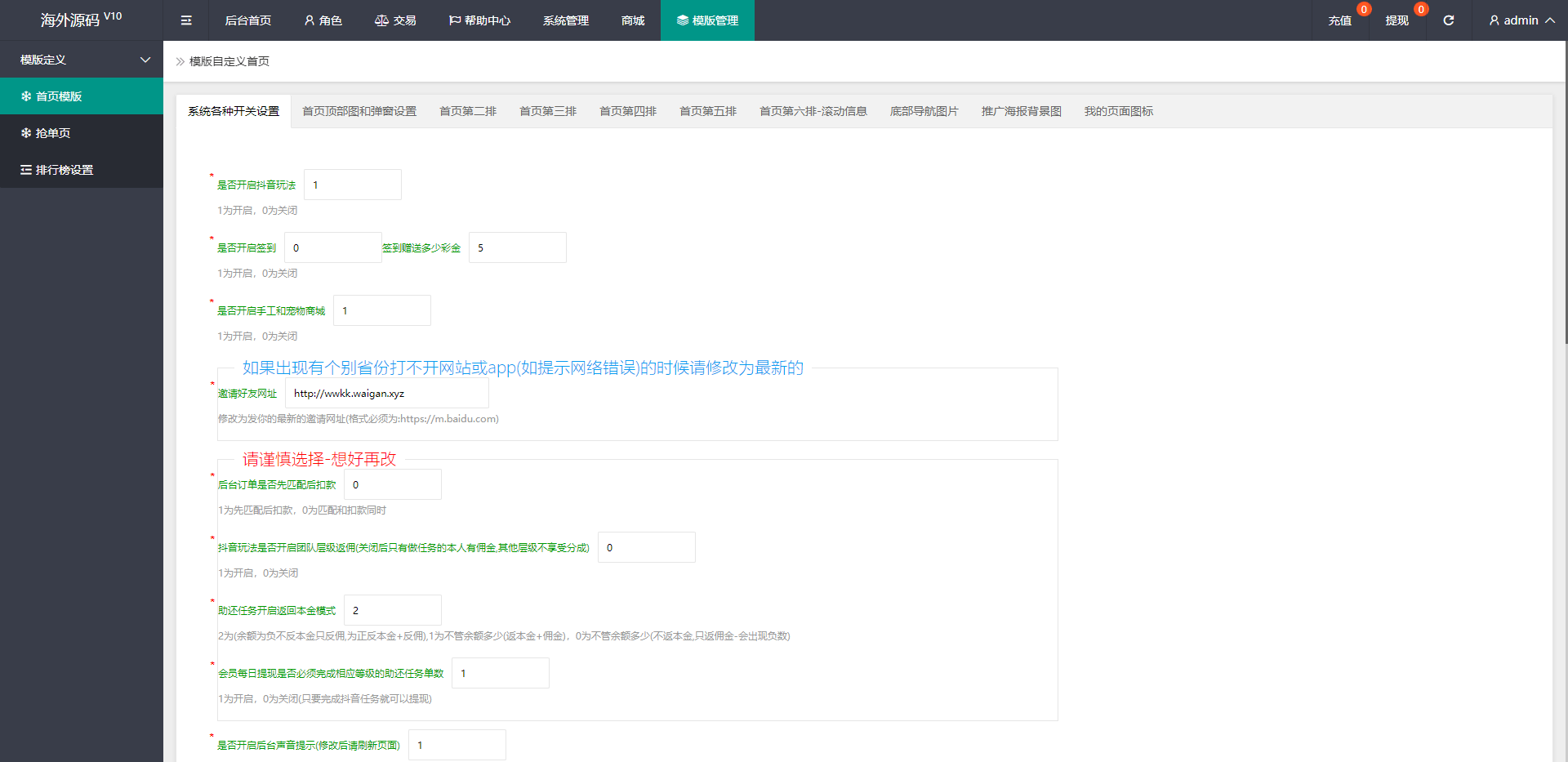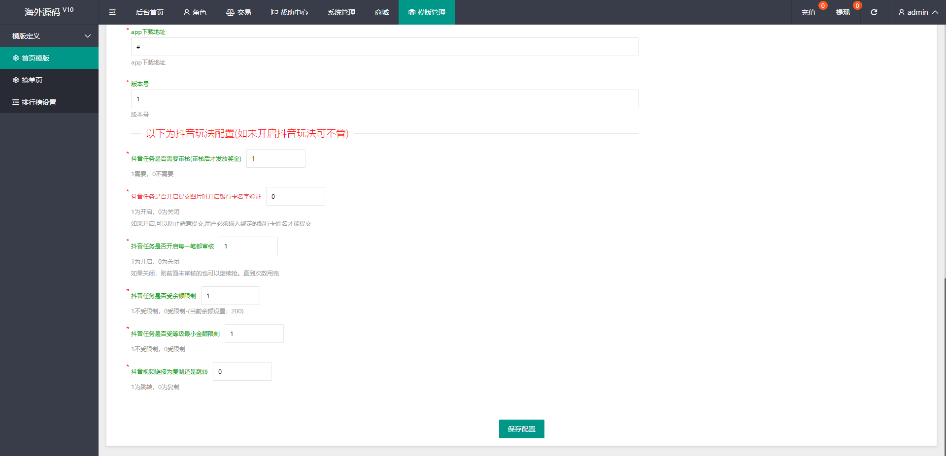 手动刷单后台可设置用户订单金额等,新增了抖音玩法前端提交后台审核,系统新增多个功能