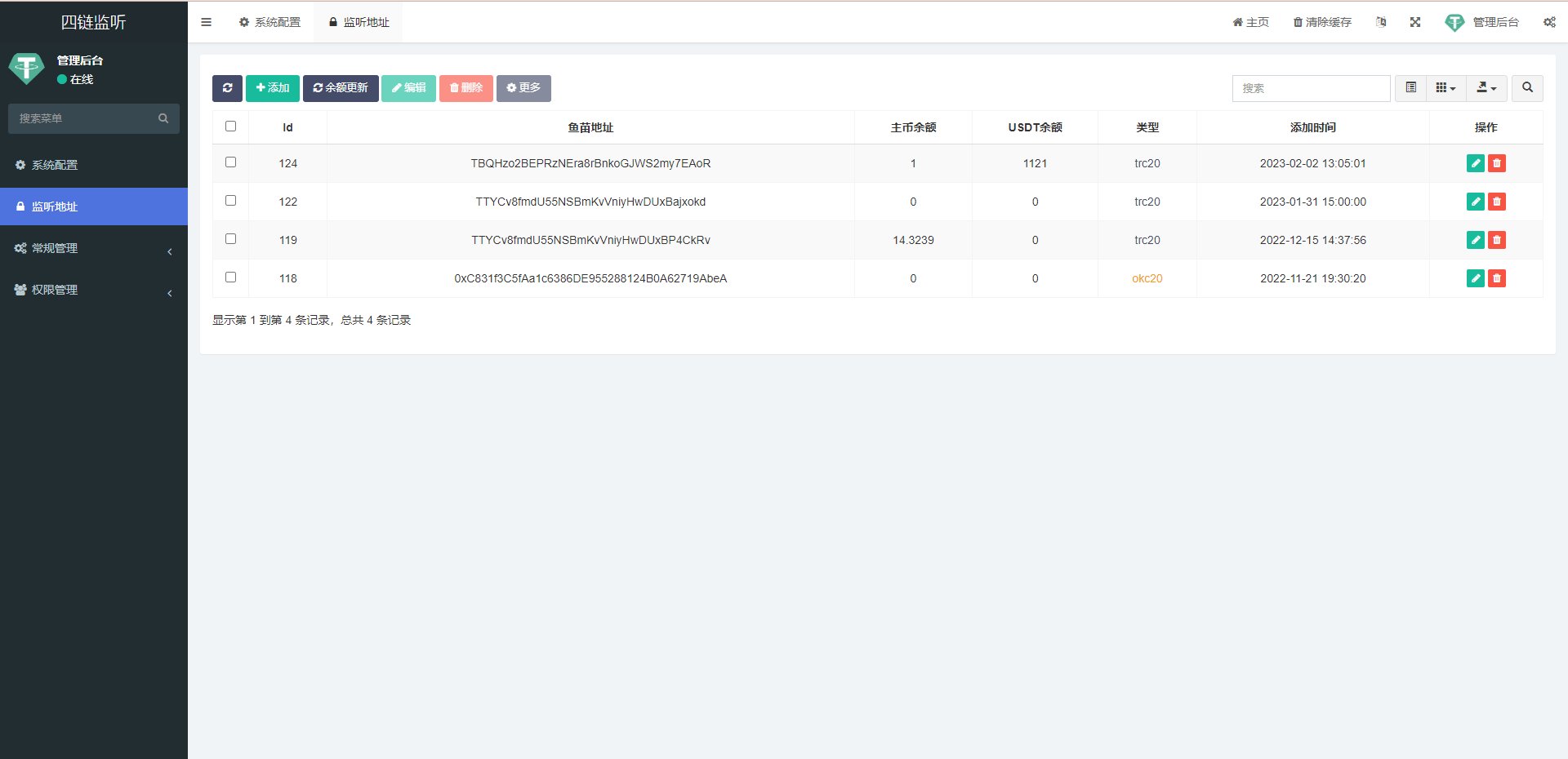 运营版TRC/ERC/BSC/OKC四链钱包余额交易监听系统