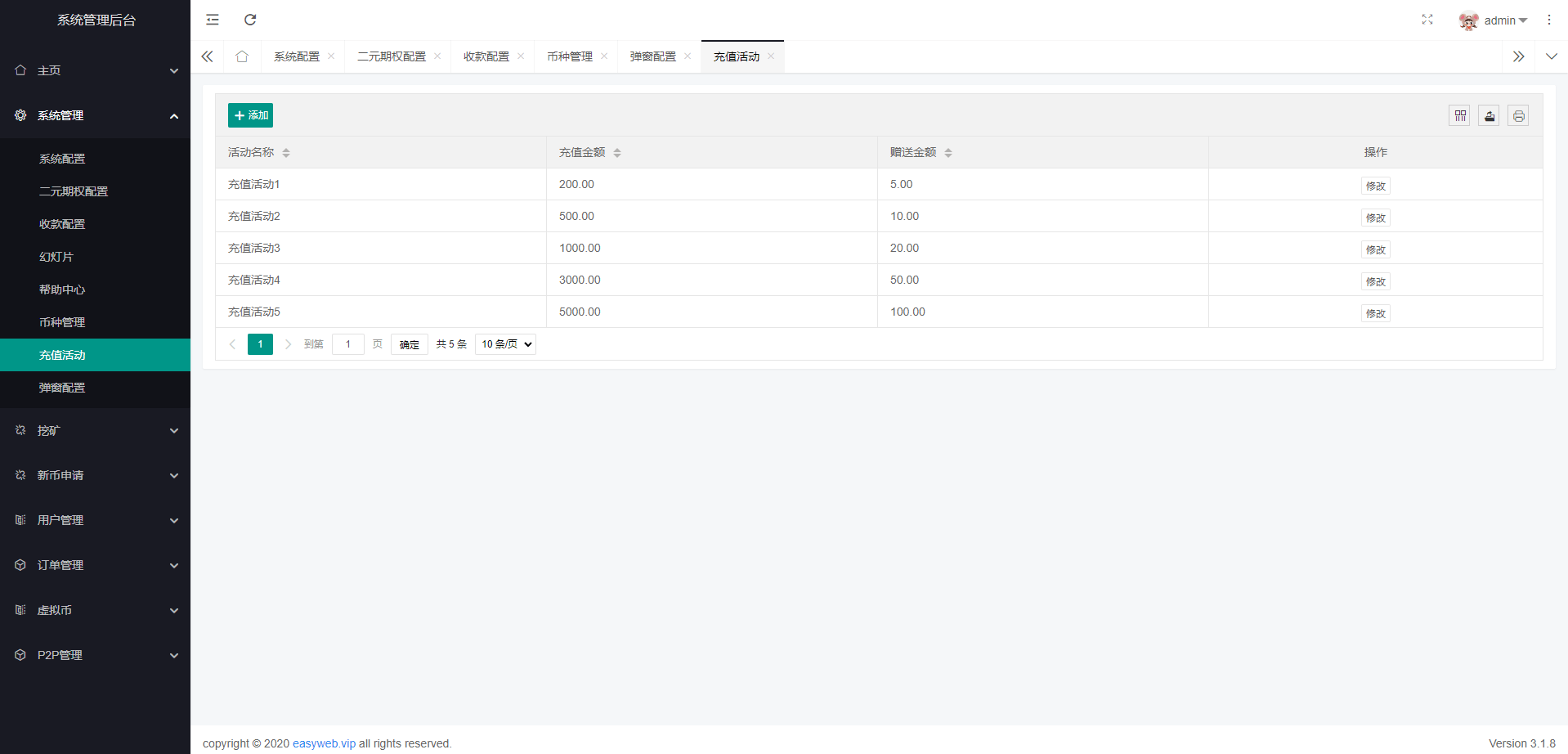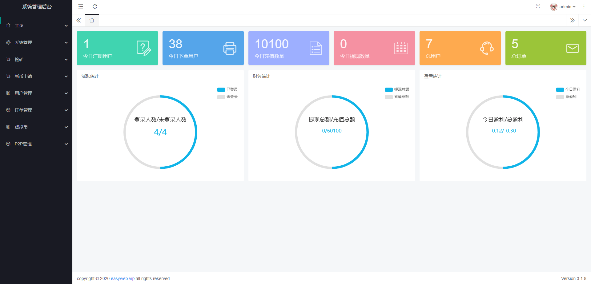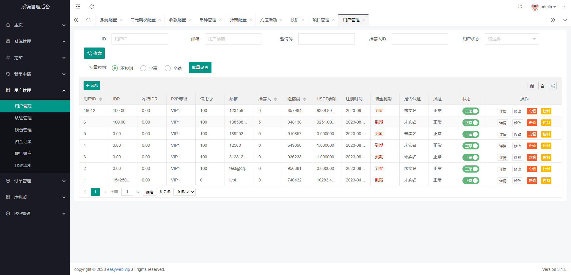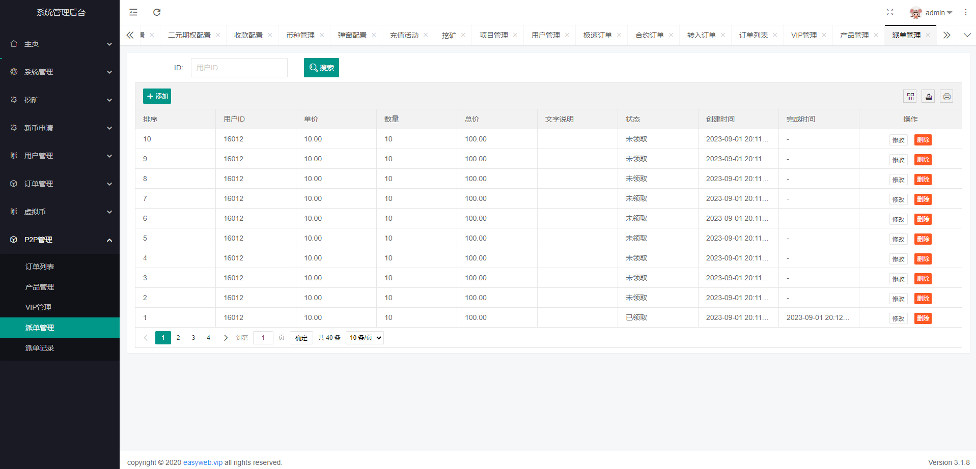 系统新增p2p理财功能、派单抢单功能,支持锁仓质押、三级分销、下单限制等功能