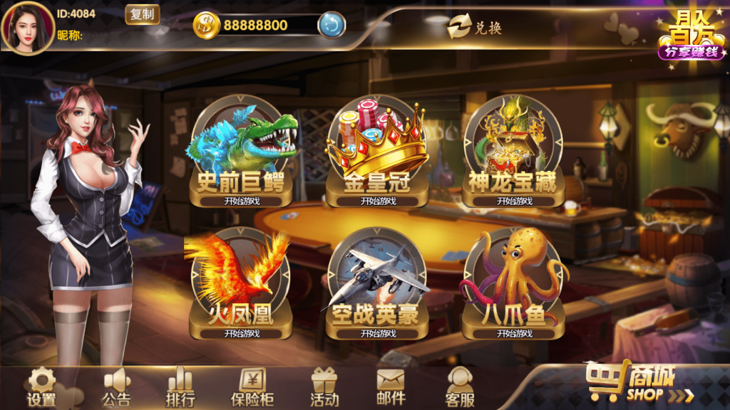 子游戏:摇钱树,金蟾捕鱼,渔乐无穷,幸运六狮,牛魔王,李逵劈鱼,单挑,金鲨银鲨,史前巨鳄,金皇冠,神龙宝藏,火凤凰,空战英豪,八爪鱼。