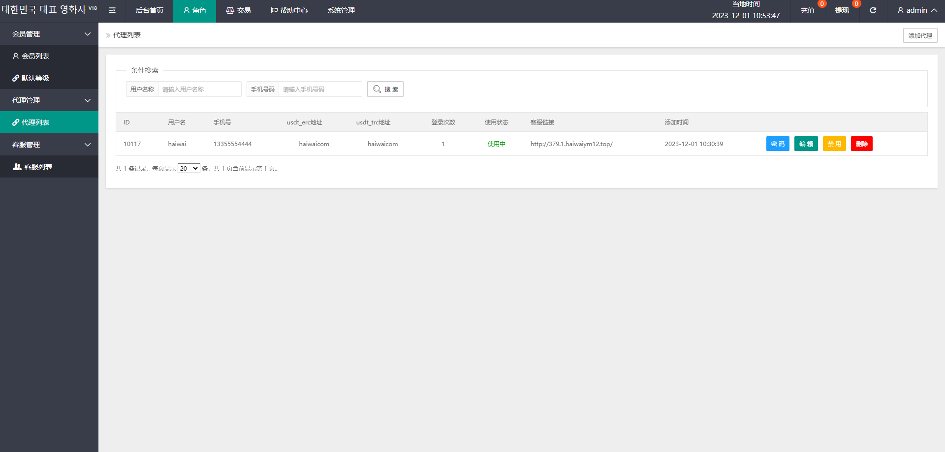 3、每个代理有自己专门的收款地址和客服(如果客户通过a代理旗下的业务员的邀请码注册,充值时展示的收款地址则是a代理的收款地址,客服亦是如此,如果不属于代理,则展示总后台的充值收款地址以及客服链接)