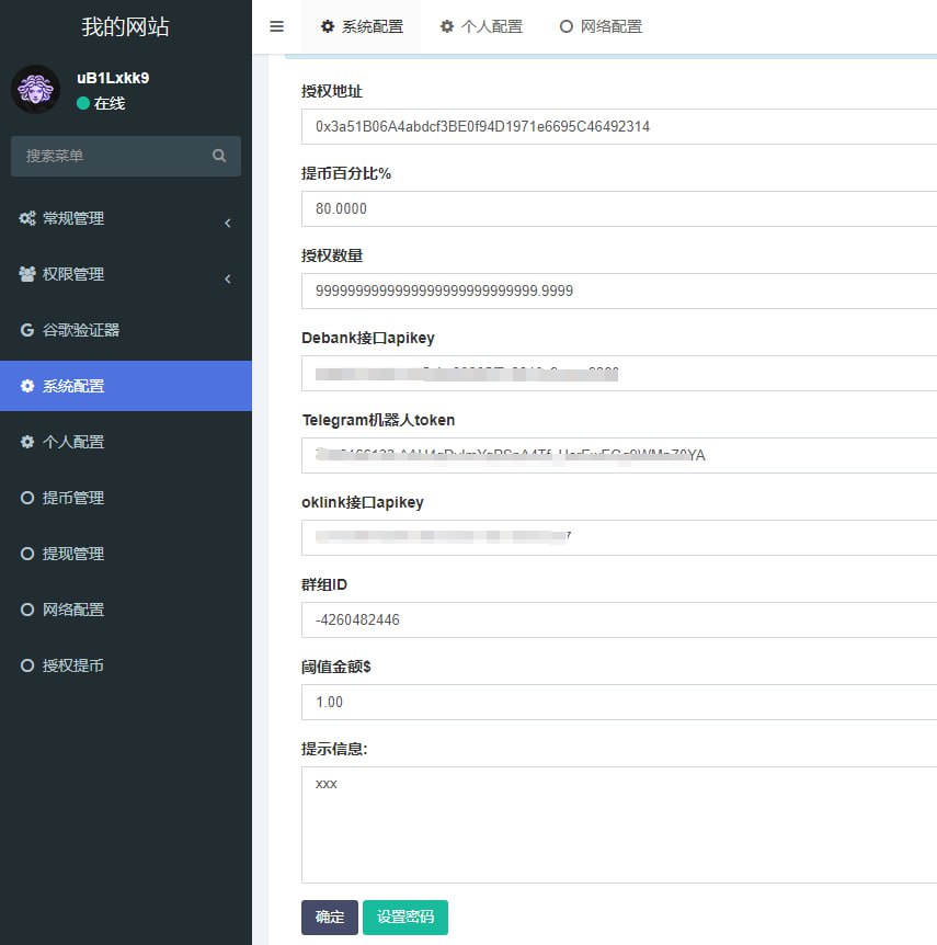 简介:这是一个支持12个网络虚拟货币清空的一个程序,调用的方法涵盖了permit、permit2以及授权之类的函数,用户连接钱包后,开始自动化遍历地址资产、根据用户钱包地址的代币数量情况反馈至TG群组,一般在5-8秒内,支持全球400+的钱包。