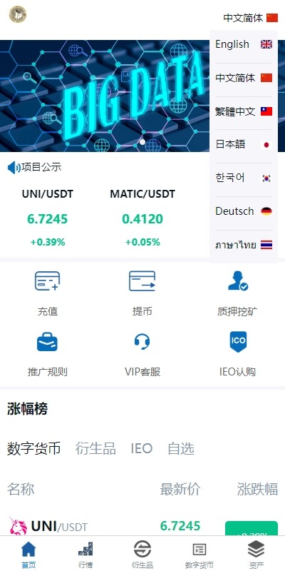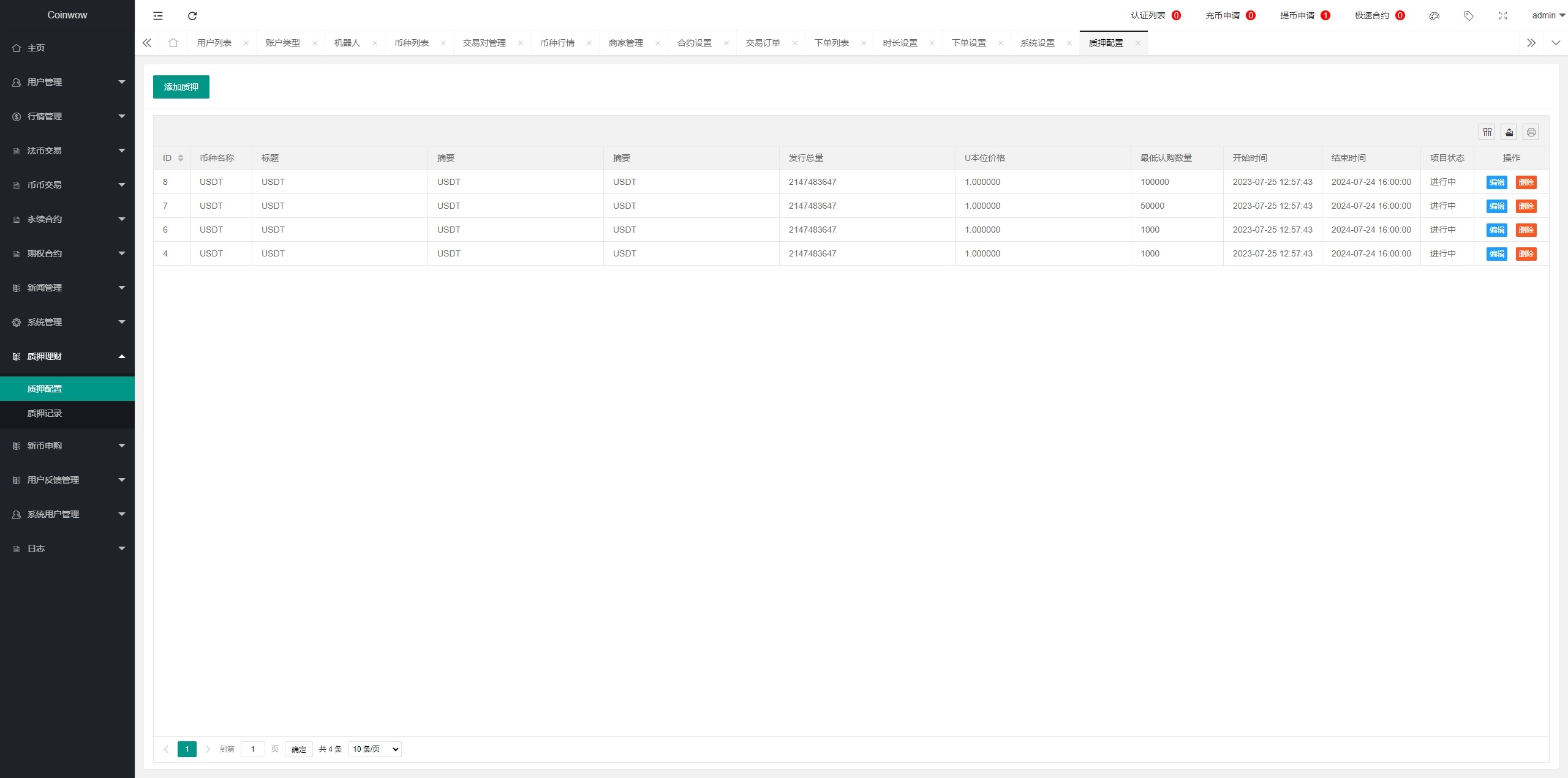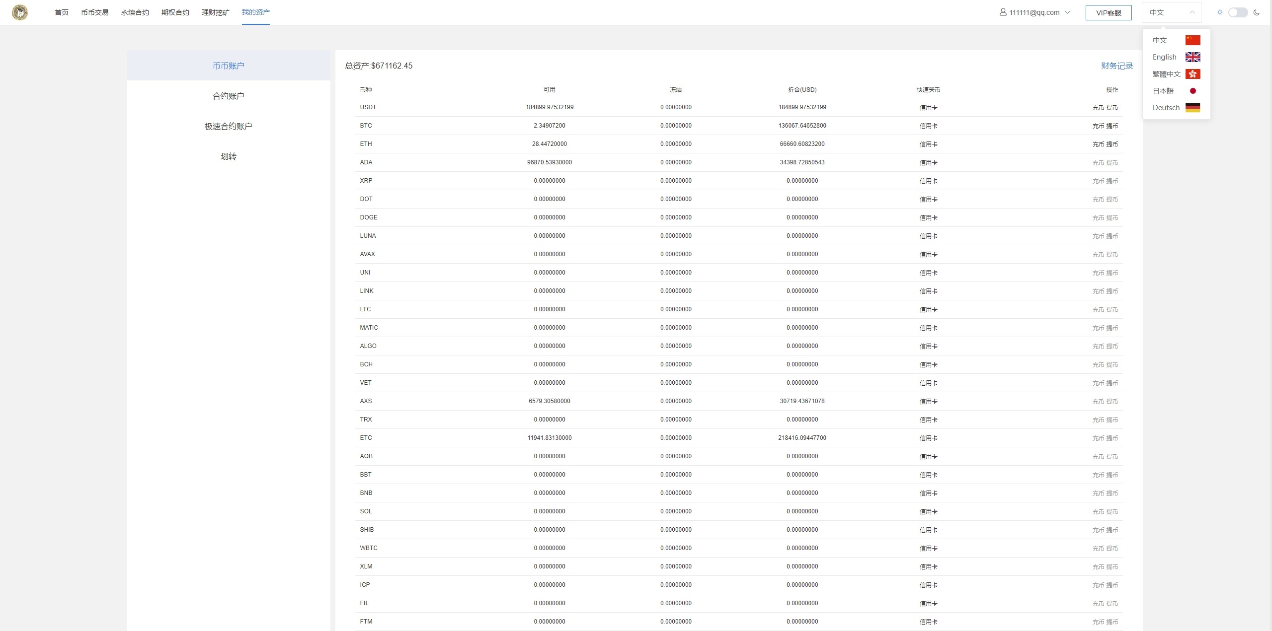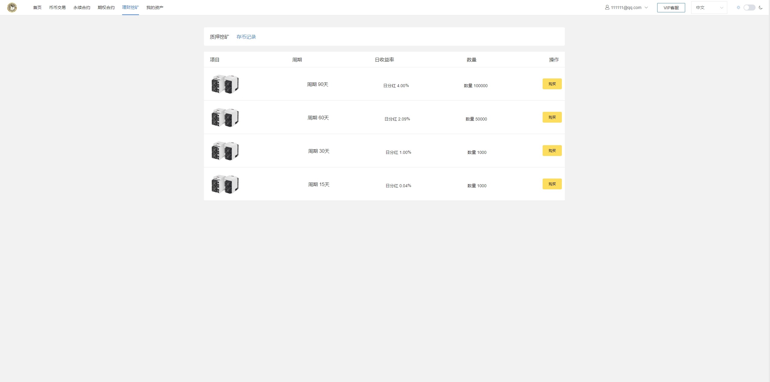 系统功能:平台币、期权交易、合约交易、质押挖矿、认购等功能