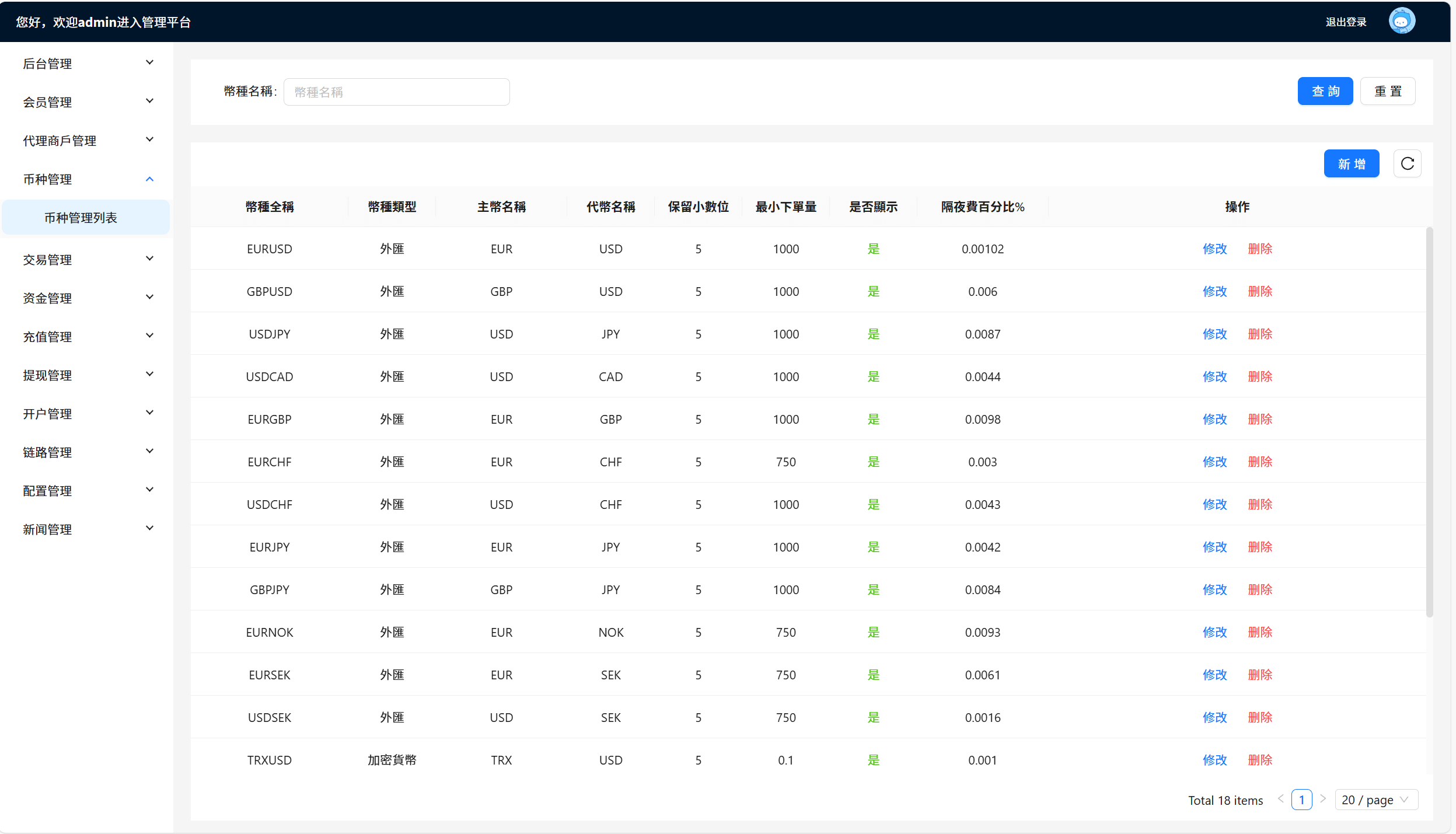 系统管理:系统设置,MT设置,返佣设置,分组同步,货币同步,等级设置,赠金规则,消息管理,日志管理,同步客户,配置参数,支付管理。