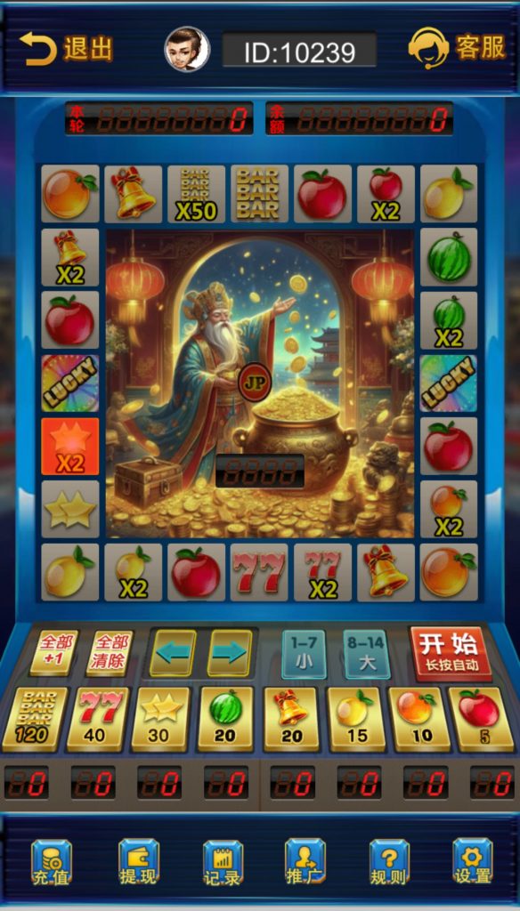 这套H5水果机-界面精美跟以前实体机玩法同样,手动点击开始按钮,长按自动开始,后台可控制中奖概率。