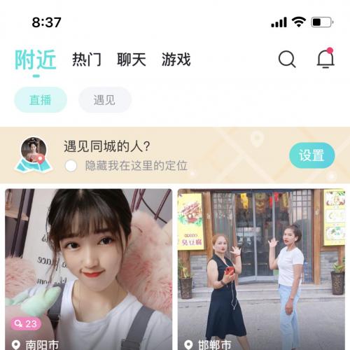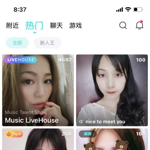 首页:附近、热门、关注、PK、1V1、嗨聊、视频速配、音视频聊天室