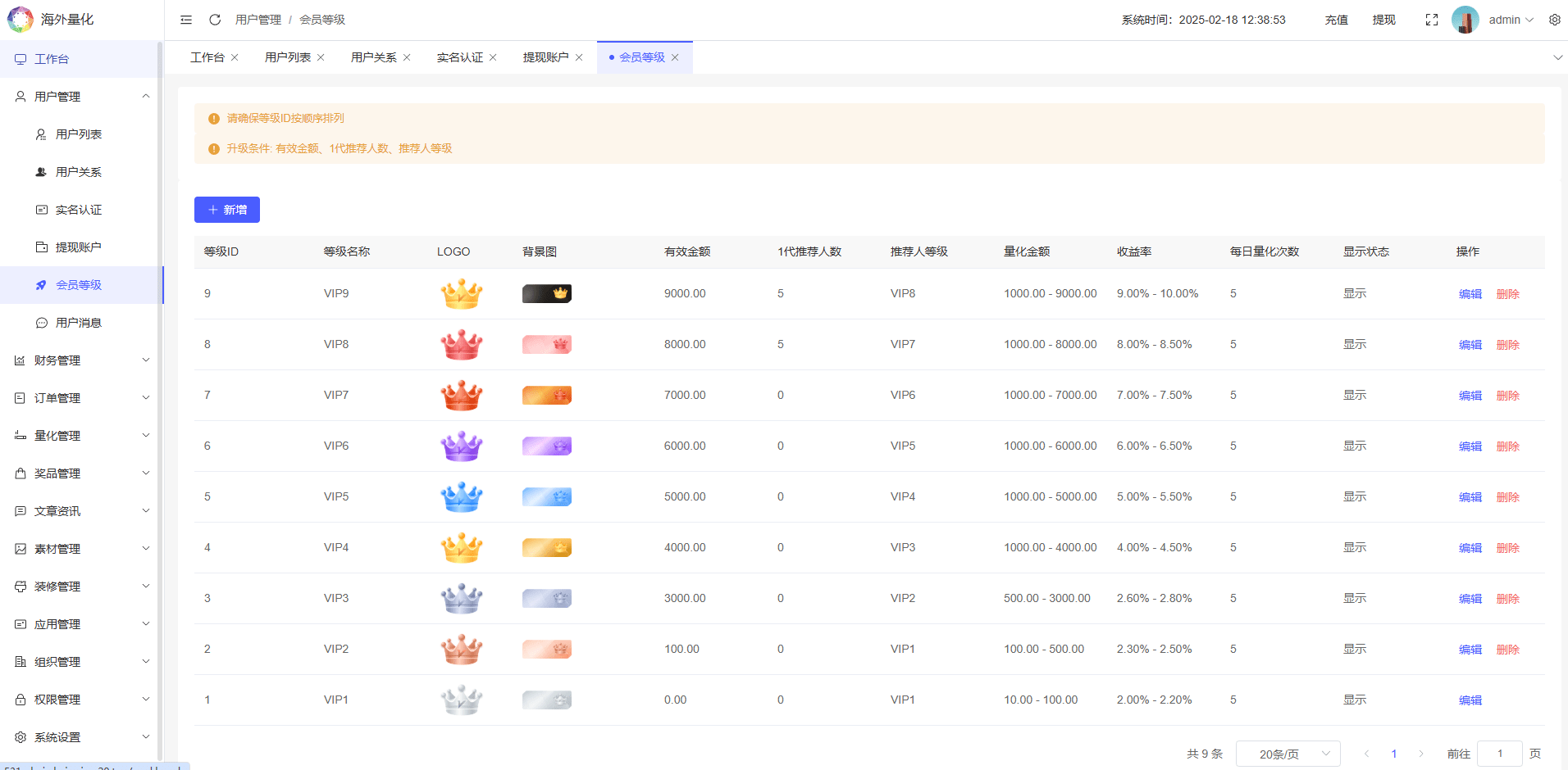 3、VIP等级划分,升级条件: 用户有效金额、1代推荐人数、推荐人等级