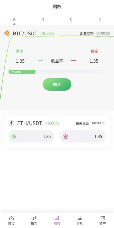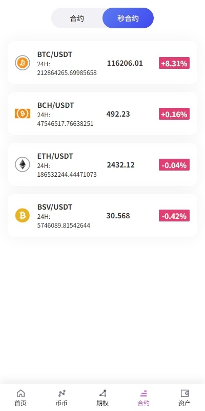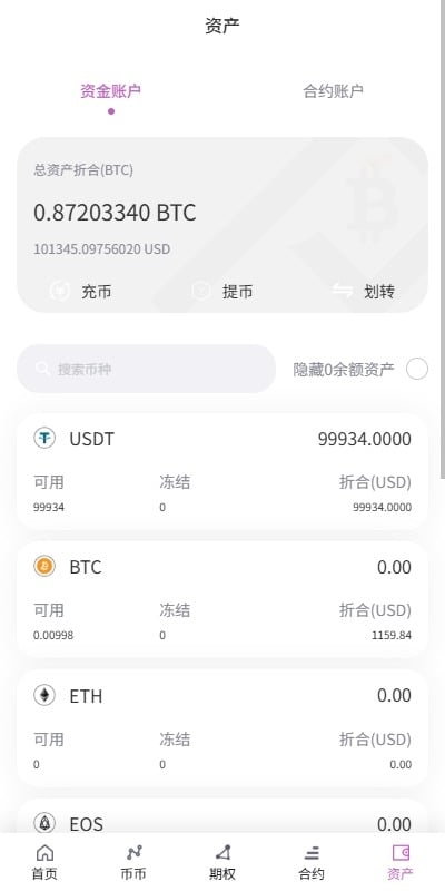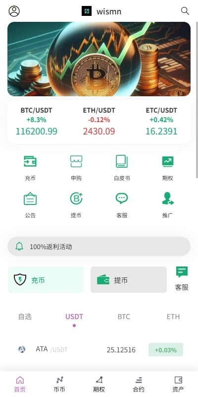 功能:币币交易,挖矿理财,申购新币,系统发行币,合约杠杆,秒合约交易,期权交易,平台币
