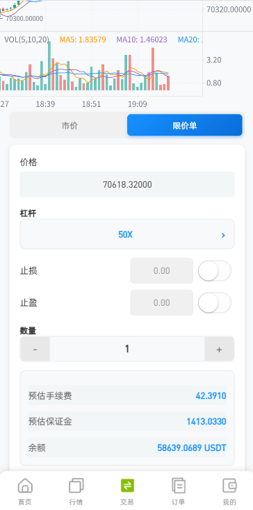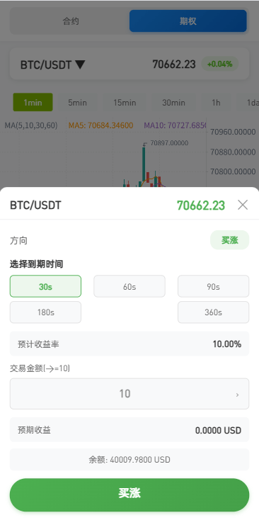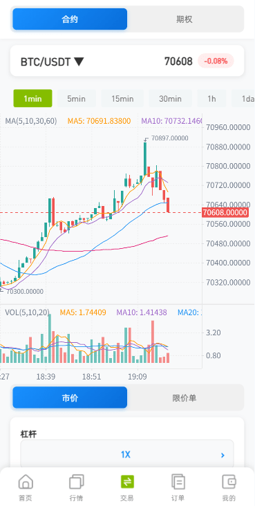 功能支持:合约,期权,理财,实名认证,钱包登陆,K线控制等功能