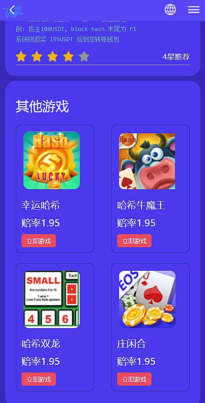 系统包含游戏:幸运哈希、哈希牛魔王、哈希双龙、庄闲合